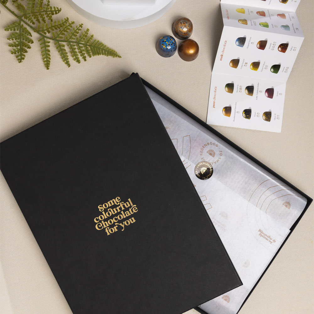 Je kunt een cadeauverpakking toevoegen aan een aan een doosje bonbons met 5, 10, 15. 24 of 35 bonbons. Om de grote cadeaudozen met een thema-inlay gaat geen cadeauverpakking. Op deze dozen staat in luxe gouden letters bedrukt: “Some colourful chocolate for you”.
