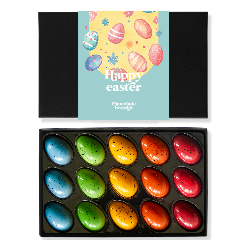 Chocoladesmaak โ Het doosje bonbon paaseitjes telt 15 bonbons in 5 verschillende smaken, namelijk: