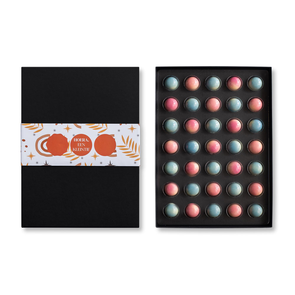 Onze handgemaakte geboorte bonbons zijn een feestje om te geven รฉn te krijgen! De luxe doos telt maar liefst 35 bonbons, gevuld met beschuit met blauwe muisjes en roze muisjes.