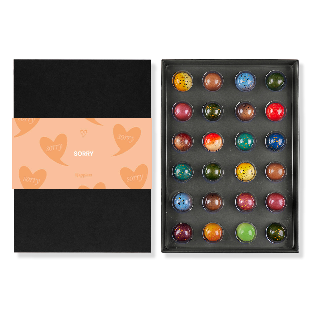 Iets goed te maken? Zeg “sorry” met een doos heerlijke Sorry bonbons. Alcoholvrij, handgemaakt door onze chocolatiers met eerlijke chocolade en de beste ingrediënten. Luxe verpakt met een cadeauwikkel met daarop de tekst “Sorry…”.