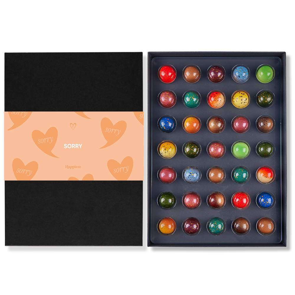 Laat iemand weten dat het je spijt met een doos Sorry bonbons. Deze luxe giftbox telt 35 alcoholvrije bonbons, handgemaakt door onze chocolatiers. Met eerlijke Belgische chocolade in combinatie met de beste ingrediënten. Verpakt met een luxe cadeauwikkel met daarop de tekst “Sorry…”.