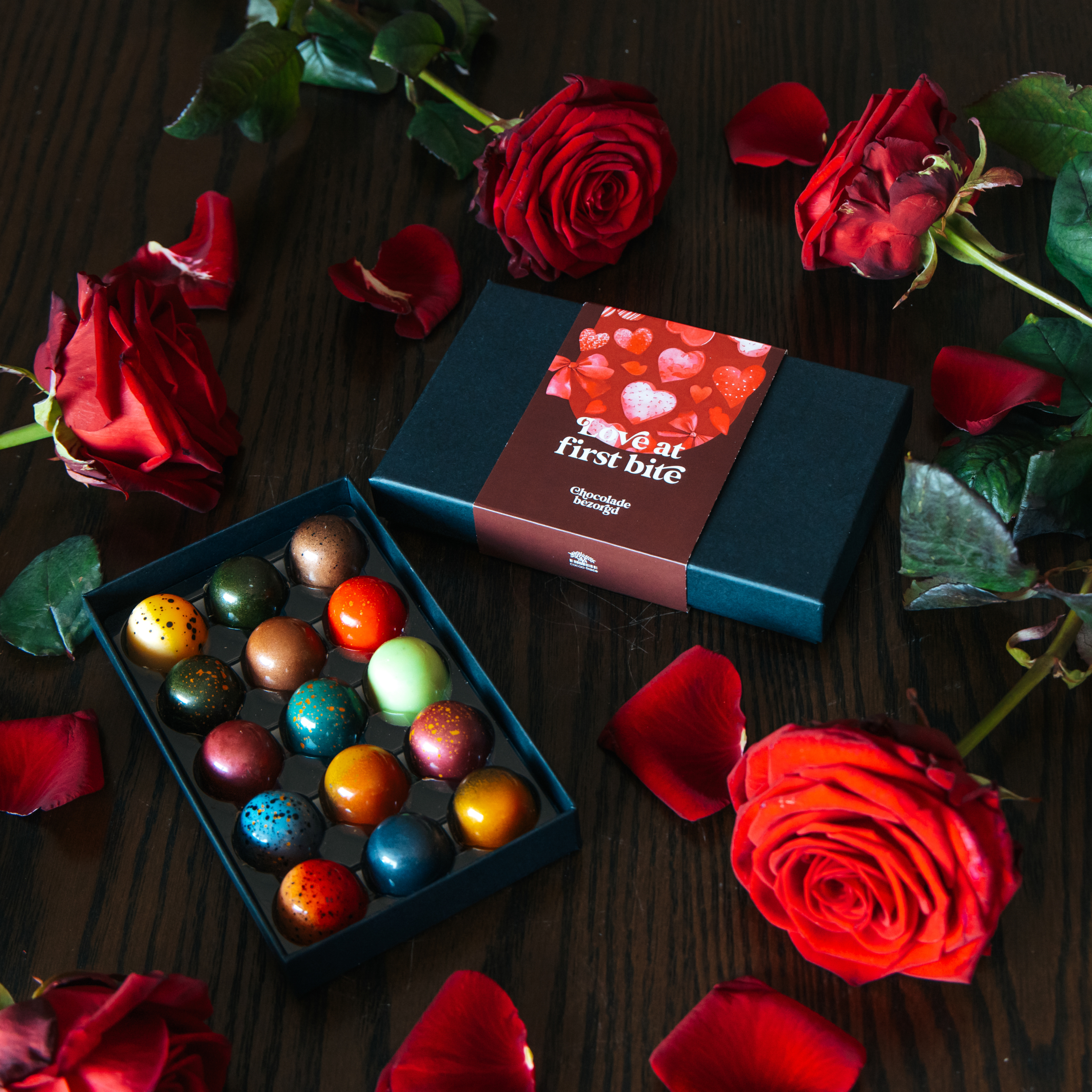 Vier Valentijn met een doosje heerlijke bonbons. Dit doosje handgemaakte bonbons verpakken we met een liefdevolle cadeauwikkel voor Valentijnsdag.