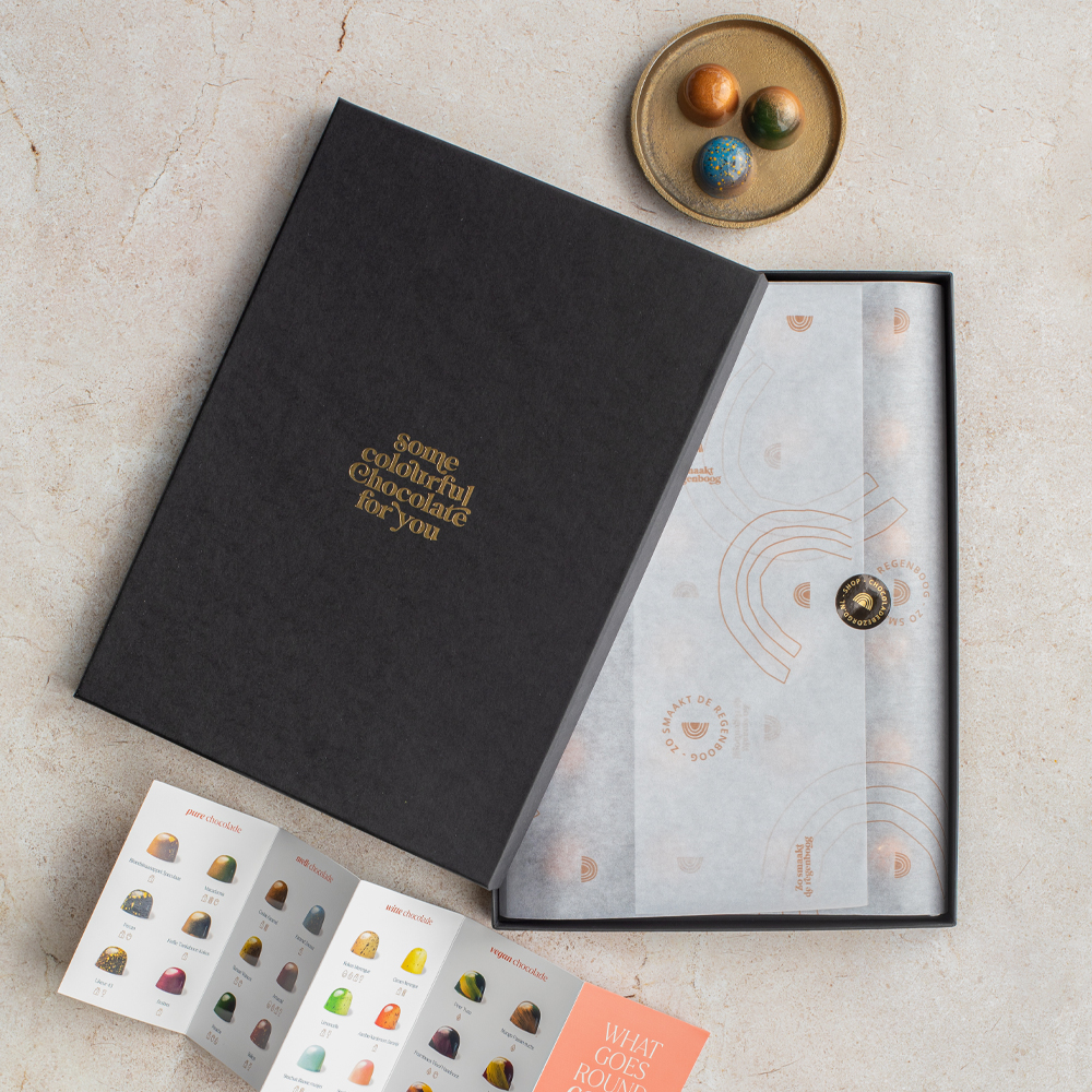 Je kunt een cadeauverpakking toevoegen aan een aan een doosje bonbons met 5, 10, 15. 24 of 35 bonbons. Om de grote cadeaudozen met een thema-inlay gaat geen cadeauverpakking. Op deze dozen staat in luxe gouden letters bedrukt: “Some colourful chocolate for you”.