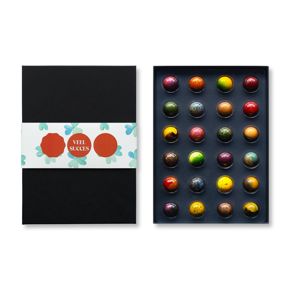 Wens iemand succes met een heerlijke verrassing in de brievenbus! Verstuur een doos met 24 handgemaakte bonbons, alcoholvrij en luxe verpakt in een vrolijke cadeauwikkel met daarop “Succes!”.