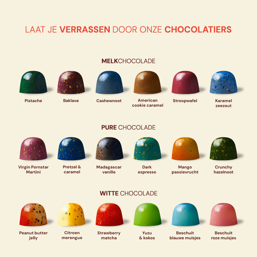 Dit doosje is samengesteld met onze favoriete smaken. Ons vaste assortiment bestaat uit 18 smaken met wisselende seizoenspecials.