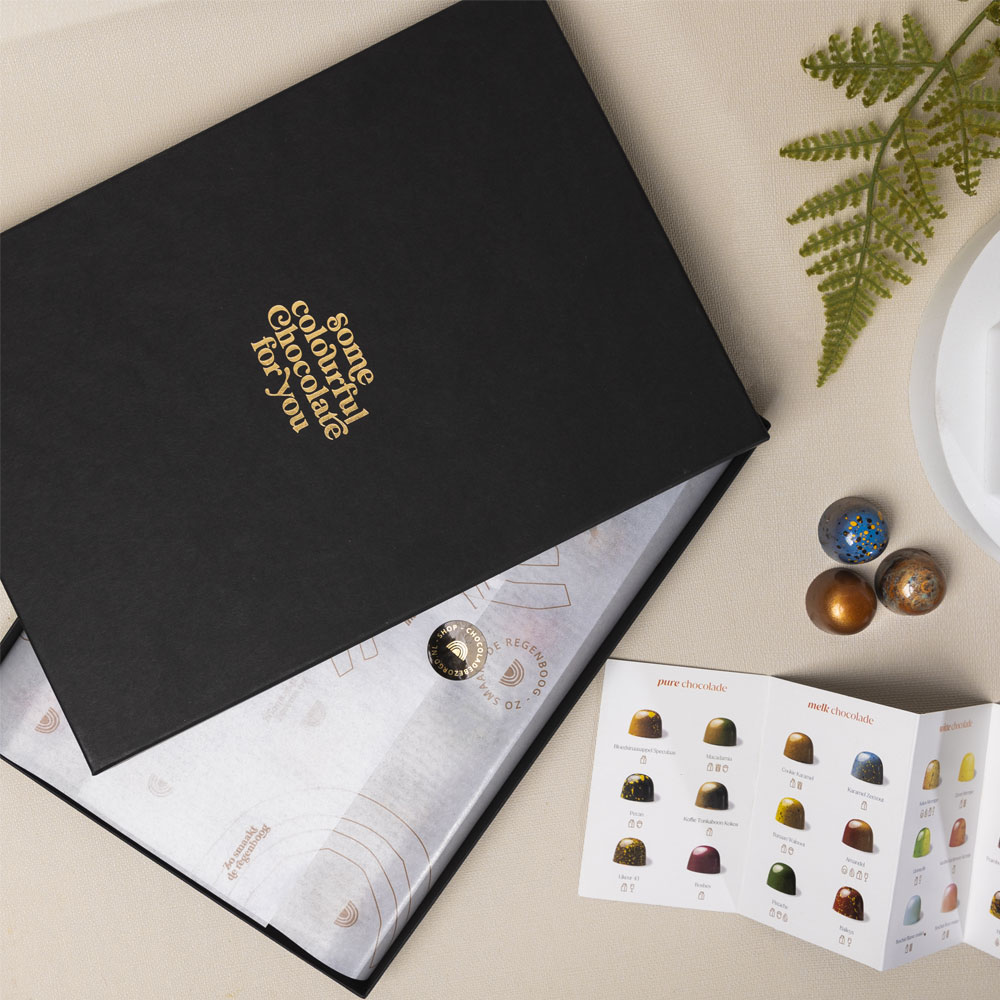 Je kunt een cadeauverpakking toevoegen aan een aan een doosje bonbons met 5, 10, 15. 24 of 35 bonbons. Om de grote cadeaudozen met een thema-inlay gaat geen cadeauverpakking. Op deze dozen staat in luxe gouden letters bedrukt: “Some colourful chocolate for you”.