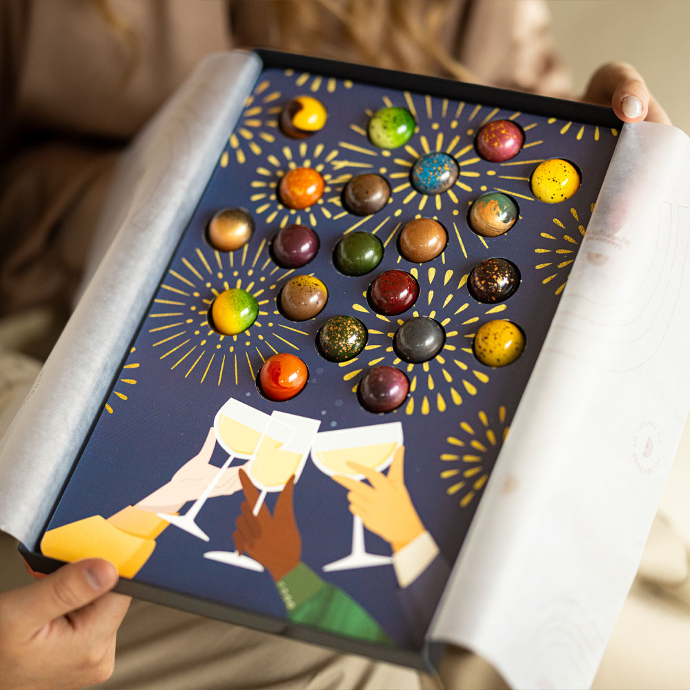 Luidt het nieuwe jaar in met onze feestelijke nieuwjaarsbox. Deze prachtige giftbox vullen we met 21 handgemaakte alcoholvrije bonbons; een origineel nieuwjaarscadeau en een heerlijke versnapering op oudejaarsavond!