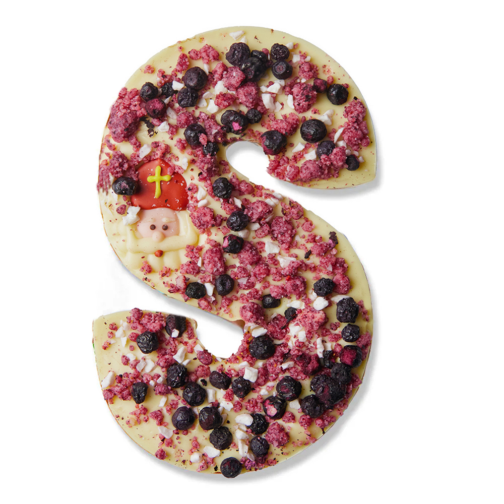 Het is altijd feest als de Sint deze chocoladeletter achterlaat in jouw schoen! Onze chocolade-hulppietjes maken de mooiste (en vooral lekkerste) creaties van chocolade! Zo ook deze prachtige witte chocoladeletter met bosvruchten en stukjes frisse yoghurt merengue.