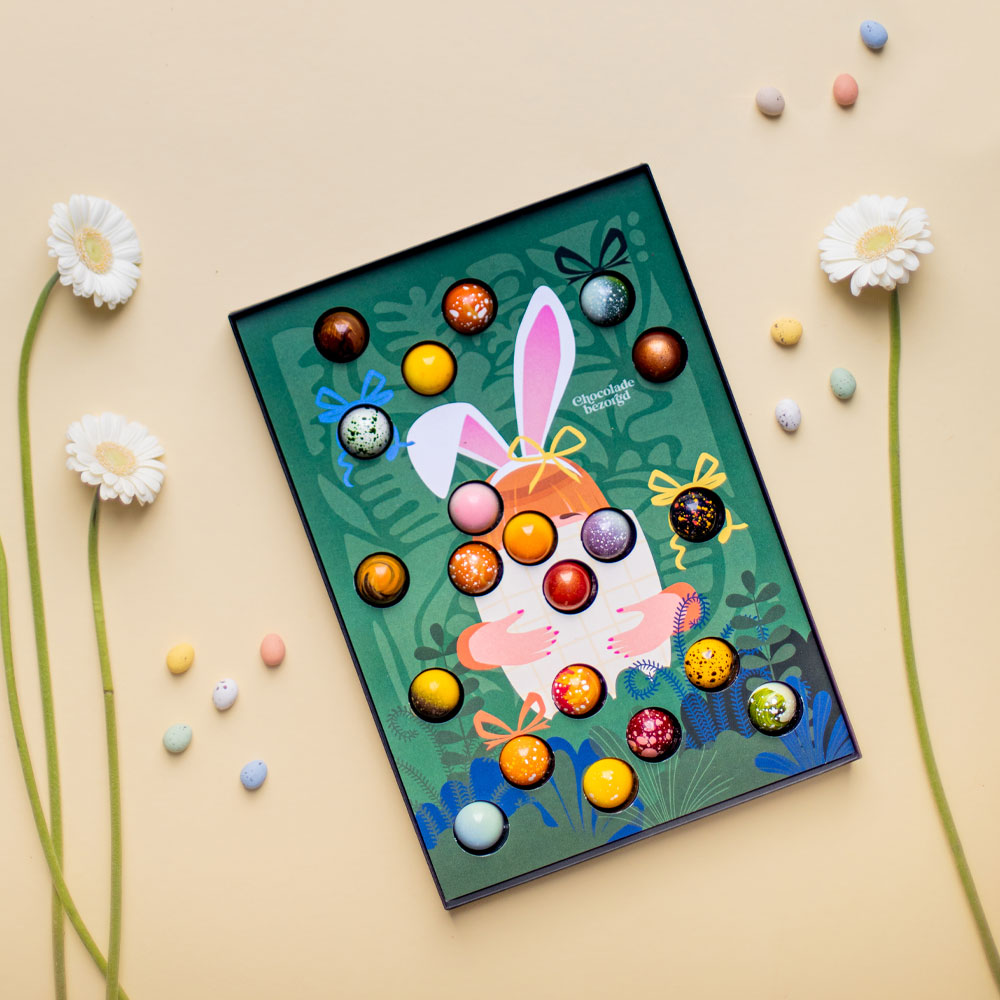 Denk je aan Pasen, dan denk je aan het verstoppen en zoeken van paaseieren. Maar wat als je die eieren niet eerst in de tuin hoeft te zoeken, maar gewoon direct op de bank kunt genieten van de lekkerste chocolade? Speciaal voor Pasen hebben we de Get Egg-Cited box, een luxe cadeaubox in paasthema gevuld met 15 รณf 21 handgemaakte bonbons. Elke bonbon is met liefde en vakmanschap gemaakt door onze chocolatiers. Het perfecte cadeau voor de echte chocoladeliefhebber!Tip: Wil je meer weten over de traditie van paaseieren? Lees dan onze blog โWaarom eten we chocolade eieren met Pasen?โ.